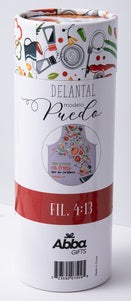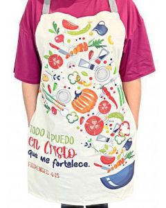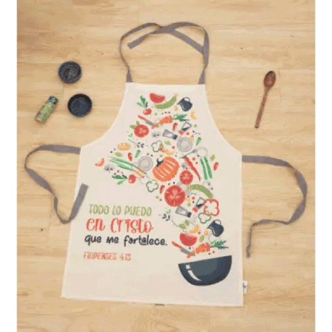 Delantal/mandil de algodón con versículo bíblicos y vívido diseño. Tamaño: 660x860 mm. Empacado en una caja de regalo tubular de gran calidad.